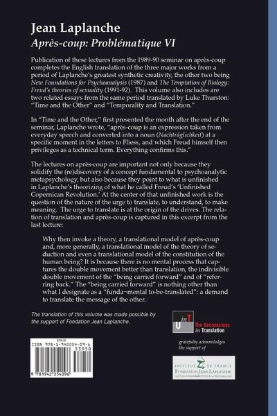Publication of these lectures from the 1989-90 seminar on après-coup completes the English translation of the three major works from a period of Laplanche's greatest synthetic creativity, the other two being New Foundations for Psychoanalysis (1987) and The Temptation of Biology: Freud's theories of sexuality (1991-92). This volume also includes two related essays from the same period translated by Luke Thurston: "Time and the Other" and "Temporality and Translation." In "Time and the Other," first presented the month after the end of the seminar, Laplanche wrote, "après-coup is an expression taken from everyday speech and converted into a noun (Nachträglichkeit) at a specific moment in the letters to Fliess, and which Freud himself then privileges as a technical term. Everything confirms this." The lectures on après-coup are important not only because they solidify the (re)discovery of a concept fundamental to psychoanalytic metapsychology, but also because they point to what is unfinished in Laplanche's theorizing of what he called Freud's 'Unfinished Copernican Revolution.' At the center of that unfinished work is the question of the nature of the urge to translate, to understand, to make meaning. The urge to translate is at the origin of the drives. The relation of translation and après-coup is captured in this excerpt from the last lecture: "Why then invoke a theory, a translational model of après-coup and, more generally, a translational model of the theory of seduction and even a translational model of the constitution of the human being? It is because there is no mental process that captures the double movement better than translation, the indivisible double movement of the "being carried forward" and of "referring back." The "being carried forward" is nothing other than what I designate as a "fundamental to-be-translated": a demand to translate the message of the other." - Jean Laplanche