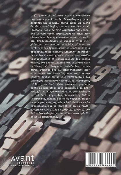 El presente volumen aborda cuestionesteóricas y prácticas defraseología y paremiología del español, tanto desde un punto de vista monolingüe, como contrastivo con el italiano. Los dieciocho capítulos que componen la obra están articulados en cinco secciones temáticas que abarcan aspectos teóricos, traductológicos en general y de lingüística contrastiva español-italiano en particular. Algunos aspectos contrastivos o traductológicos (español-italiano) se refieren a los fraseologismos vistos como escollo traductológico si consideramos: los falsos amigos, los fraseologismos con palabras diacríticas, el lenguaje metafórico, entre otros. Pasando por el comportamiento discursivo de los fraseologismos en diversos géneros textuales, se hace referencia a los lenguajes especiales/sectoriales (deportivo, político, marino). Cabe destacar que una parte de este libro está dedicada a la fraseología en Hispanoamérica, en particular a la del Perú, Argentina, Venezuela y Chile. Recordamos, además, que en el volumen destaca una parte consagrada a la didáctica de la fraseología, que se concretiza en la realización de una Unidad didáctica sobre el uso de la fraseología que se ofrece como apéndice de la monografía.