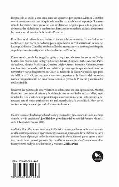 Después de su exilio y tras once años sin ejercer el periodismo, Mónica González volvió a sentarse ante una máquina de escribir para publicar el reportaje "La mansión de Lo Curro". Su regreso fue una declaración de principios: a la urgencia de denunciar las violaciones a los derechos humanos se sumaba la audacia de mostrar la corrupción al interior de la familia Pinochet. Este libro es el reflejo de una voluntad incansable por encontrar la verdad en un contexto en que hacer periodismo podía significar la cárcel, cuando no la muerte. La propia Mónica González recibió múltiples amenazas y su auto explotó después de publicar una investigación sobre los bienes de Pinochet. Como en el coro de las tragedias griegas, aquí escuchamos las voces de Gladys Marín, Sola Sierra, Raúl Pellegrin, Carmen Gloria Quintana, Isabel Allende, Patricio Aylwin, Mónica Madariaga, Gustavo Leigh y Arturo Fontaine Aldunate, entre muchas otras. Además, está la entrevista al primer agente que confesó cómo se torturaba y hacía desaparecer en Chile; el relato de la Flaca Alejandra, que pasó del MIR a la DINA, entregando a muchos compañeros; la historia del impresionante enriquecimiento de Julio Ponce Lerou, el yerno de Pinochet y controlador de Soquimich. Recorrer las páginas de este volumen es adentrarse en una época feroz. Mónica González transmite el miedo y la violencia que se respiraba en las calles, logra develar los niveles de descomponsición que alcanzaron nuestras instituciones y demuestra que el mejor periodismo no está supeditado a la actualidad. Muy por el contrario, adquiere categoría de documento histórico.