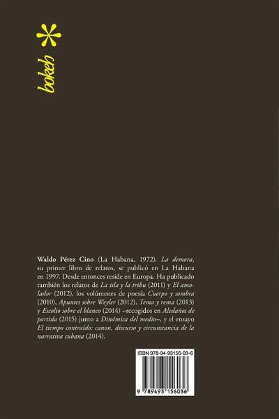 Waldo Pérez Cino (La Habana, 1972). La demora, su primer libro de relatos, se publicó en La Habana en 1997. Desde entonces reside en Europa. Ha publicado también los relatos de La isla y la tribu (2011) y El amolador (2012), los volúmenes de poesía Cuerpo y sombra (2010), Apuntes sobre Weyler (2012), Tema y rema (2013) y Escolio sobre el blanco (2014) -recogidos en Aledaños de partida (2015) junto a Dinámica del medio-, y el ensayo El tiempo contraído: canon, discurso y circunstancia de la narrativa cubana (2014).