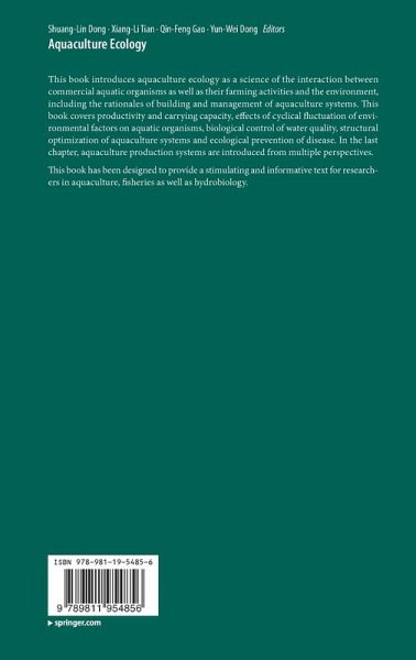 This book introduces aquaculture ecology as a science of the interaction between commercial aquatic organisms as well as their farming activities and the environment, including the rationales of building and management of aquaculture systems. This book covers productivity and carrying capacity, effects of cyclical fluctuation of environmental factors on aquatic organisms, biological control of water quality, structural optimization of aquaculture systems and ecological prevention of disease. In the last chapter, aquaculture production systems are introduced from multiple perspectives. This…mehr