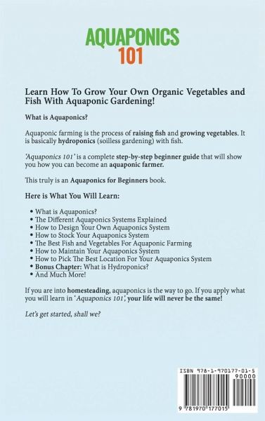 Learn the Basics of Aquaponics! Learn How To Grow Your Own Organic Vegetables and Fish With Aquaponic Gardening. Would you like to grow your own organic: - Fruits - Herbs - Vegetables - Fish With Aquaponics, you can! Get Your Copy of: 'Aquaponics 101' What is Aquaponics? Aquaponic farming is the process of raising fish and vegetables. It is basically hydroponics (soilless gardening) with fish. Growing your own food with aquaponics is a wise investment. One that will yield many benefits! - You won't have to rely on other people's produce - You will know that the food you consume is free of chemicals And it can also be a profitable investment: after buying your aquaponics system, you will recoup that investment by saving money (and time!) on groceries. You could even sell your fish and vegetables and gain a profit! Why You Should Check Out 'Aquaponics 101' 'Aquaponics 101' is a complete step-by-step beginner guide that will show you how you can become an aquaponic farmer. This no-fluff Aquaponics Gardening Guide will teach you how to build and operate an aquaponic system. What's most important: I will take you by the hand and teach you everything you need to know about aquaponic farming. BUY: 'Aquaponics 101' This truly is a book for beginners. Here is What You Will Learn: - What is Aquaponics? - The Different Aquaponics Systems Explained - How to Design Your Own Aquaponics System - How to Stock Your Aquaponics System - The Best Fish and Vegetables For Aquaponic Farming - How to Maintain Your Aquaponics System - How to Pick The Best Location For Your Aquaponics System - And Much More! Finally, as a FREE & EXCLUSIVE BONUS, you'll also get the chapter 'What is Hydroponics?' from my other book 'Hydroponics 101.' To recap: If you apply what you will learn in 'Aquaponics 101', gardening will never be the same! So, let's get started, shall we? Take action now! Scroll to the top of this page and click the 'Buy Now' button.