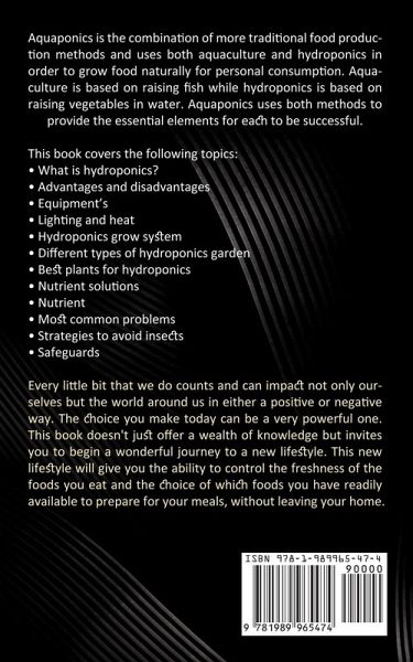 Aquaponics is the combination of more traditional food production methods and uses both aquaculture and hydroponics in order to grow food naturally for personal consumption. Aquaculture is based on raising fish while hydroponics is based on raising vegetables in water. Aquaponics uses both methods to provide the essential elements for each to be successful. This book covers the following topics: ¿ What is hydroponics? ¿ Advantages and disadvantages ¿ Equipment's ¿ Lighting and heat ¿ Hydroponics grow system ¿ Different types of hydroponics garden ¿ Best plants for hydroponics ¿ Nutrient solutions ¿ Nutrient ¿ Most common problems ¿ Strategies to avoid insects ¿ Safeguards Every little bit that we do counts and can impact not only ourselves but the world around us in either a positive or negative way. The choice you make today can be a very powerful one. This book doesn't just offer a wealth of knowledge but invites you to begin a wonderful journey to a new lifestyle. This new lifestyle will give you the ability to control the freshness of the foods you eat and the choice of which foods you have readily available to prepare for your meals, without leaving your home.