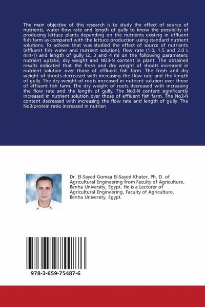The main objective of this research is to study the effect of source of nutrients, water flow rate and length of gully to know the possibility of producing lettuce plants depending on the nutrients existing in effluent fish farm as compared with the lettuce production using standard nutrient solutions. To achieve that was studied the effect of source of nutrients (effluent fish water and nutrient solution), flow rate (1.0, 1.5 and 2.0 L min-1) and length of gully (2, 3 and 4 m) on the following parameters: nutrient uptake, dry weight and NO3-N content in plant. The obtained results indicated that the fresh and dry weight of shoots increased in nutrient solution over those of effluent fish farm. The fresh and dry weight of shoots decreased with increasing the flow rate and the length of gully. The dry weight of roots increased in nutrient solution over those of effluent fish farm. The dry weight of roots decreased with increasing the flow rate and the length of gully. The No3-N content significantly increased in nutrient solution over those of effluent fish farm. The No3-N content decreased with increasing the flow rate and length of gully. The No3/protein ratio increased in nutrien