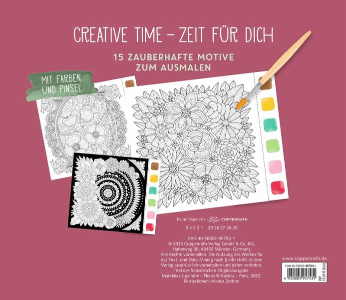 Ein Malblock mit 15 wundervollen Ausmalbildern, 6 Aquarellfarben und Pinsel.