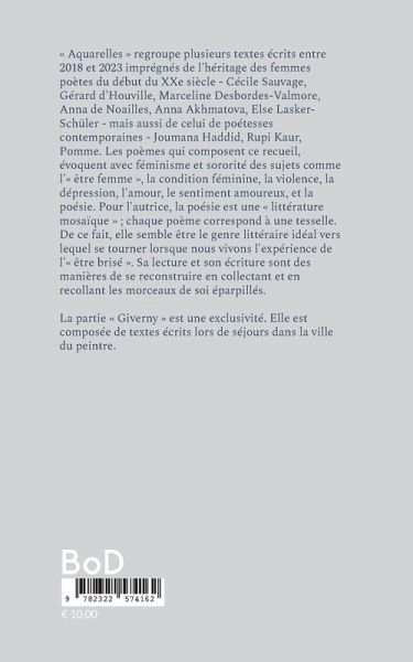 « Aquarelles » regroupe plusieurs textes écrits entre 2018 et 2023 imprégnés de l'héritage des femmes poètes du début du XXe siècle - Cécile Sauvage, Gérard d'Houville, Marceline Desbordes-Valmore, Anna de Noailles, Anna Akhmatova, Else Lasker-Schüler - mais aussi de celui de poétesses contemporaines - Joumana Haddid, Rupi Kaur, Pomme. Les poèmes qui composent ce recueil, évoquent avec féminisme et sororité des sujets comme l'« être femme », la condition féminine, la violence, la dépression, l'amour, le sentiment amoureux, et la poésie. Pour l'autrice, la poésie est une « littérature mosaïque » ; chaque poème correspond à une tesselle. De ce fait, elle semble être le genre littéraire idéal vers lequel se tourner lorsque nous vivons l'expérience de l'« être brisé ». Sa lecture et son écriture sont des manières de se reconstruire en collectant et en recollant les morceaux de soi éparpillés. La partie « Giverny » est une exclusivité. Elle est composée de textes écrits lors de séjours dans la ville du peintre.