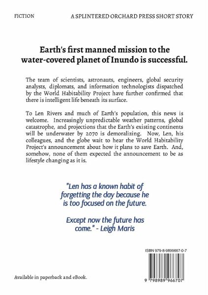 Earth's first manned mission to the water-covered planet of Inundo is successful. The team of scientists, astronauts, engineers, global security analysts, diplomats, and information technologists dispatched by the World Habitability Project have further confirmed that there is intelligent life beneath its surface. To Len Rivers and much of Earth's population, this news is welcome. Increasingly unpredictable weather patterns, global catastrophe, and projections that the Earth's existing continents will be underwater by 2070 is demoralizing. Now, Len, his colleagues, and the globe wait to hear the World Habitability Project's announcement about how it plans to save Earth. And, somehow, none of them expected the announcement to be as lifestyle changing as it is.