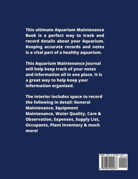 This Aquarium Maintenance Log Tracker is a perfect way to record, keep track, and keeping up-to-date with your aquarium maintenance and care. The interior pages include space to record the following: Aquarium ID, Size & Date - Write aquarium id, what size it is, and the date. General Maintenance - Log Water Change, General Cleaning, Gravel Cleaning, Algae Cleaning, Livestock Inspections, Notes for other. Equipment Maintenance - Record the Filter Maintenance, Media Cleaned, Media Replaced, Air Pump/ Hoses, Lighting, Notes for other. Water Quality - Record pH, Ammonia, Nitrates, Nitrites, GH, Notes for other. General Care & Observations - Log Feeding Schedule, Spawning, Water Temperature & Quality, Medications, Water Conditioners, Disease Diagnosis. Expenses - For equipment, Fish, Plants, Maintenance, Medication, Food, Supplies, & Total Cost. Aquarium Occupants - Record Name, Quantity, & Date of each. Supplies List - Log Item, Quantity, Supplier, & Date Purchased. Plant Inventory - Write Species, Date Added, & Blank Lined Notes. Health History - Record Pet Name, Tank #, Date Sick, Treatment Plan, # of Days Treated, & Was Treatment a Succes? Feeding Log - Checkboxes for Feeding each day of the week, & morning, noon, and night. This Aquarium Maintenance & Care Journal can help you keep your aquarium in optimum health and allows you to monitor and record everything properly. Also makes a great gift for that special person in your life that loves their fish and wants to maintain a healthy aquarium. Simple and easy to use. Size is 8.5x11 inches, 104 pages, black ink, white paper, soft matte finish cover, paperback. Get your copy today!