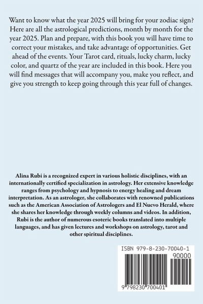 Want to know what the year 2025 will bring for your zodiac sign? Here are all the astrological predictions, month by month for the year 2025. Plan and prepare, with this book you will have time to correct your mistakes, and take advantage of opportunities. Get ahead of the events. Your Tarot card, rituals, lucky charm, lucky color, and quartz of the year are included in this book. Here you will find messages that will accompany you, make you reflect, and give you strength to keep going through this year full of changes.