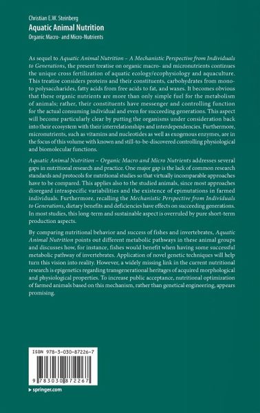 Aquatic Animal Nutrition - Organic Macro and Micro Nutrients addresses several gaps in nutritional research and practice. One major gap is the lack of common research standards and protocols for nutritional studies so that virtually incomparable approaches have to be compared. This applies also to the studied animals, since most approaches disregard intraspecific variabilities and the existence of epimutations in farmed individuals. Furthermore, recalling the Mechanistic Perspective from Individuals to Generations, dietary benefits and deficiencies have effects on succeeding generations. In most studies, this long-term and sustainable aspect is overruled by pure short-term production aspects.
