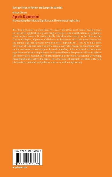 This book presents a comprehensive survey about the most recent developments in industrial applications, processing techniques and modifications of polymers from marine sources. It systematically introduces the reader to the biomaterials Chitin, Collagen, Alginates, Cellulose and Polyesters and links their interwoven industrial significance and environmental implications. The book elucidates the impact of industrial sourcing of the aquatic system for organic and inorganic matter on the environment and deepens the understanding of the industrial and economic significance of aquatic biopolymers. Further it addresses the question of how to balance the conservation of aquatic life and the industrial and economic interest in developing biodegradable alternatives for plastic. Thus the book will appeal to scientists in the field of chemistry, materials and polymer science as well as engineering.