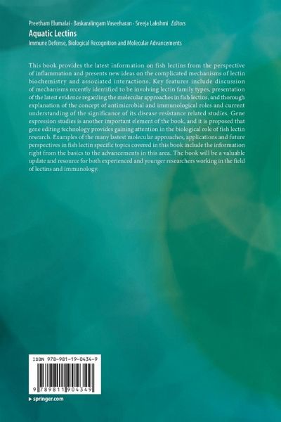 1. Fish Lectins: History, Types and structural classification.- 2. Legume Lectins.- 3. Cereal Lectins.- 4. P-type Lectins.- 5. S-type Lectins.- 6. C-Type Lectins.- 7. Pentraxins.- 8. Localization and diverse distribution of fish lectins.- 9. Fish lectins in host-pathogen interaction.- 10. Antimicrobial and Immunomodulatory role of fish lectins.- 11. Regulation of fish lectin expression during infection.- 12. Role of lectin in biofilm inhibition.- 13. USe of lectins for defence molecules haemagglutination, endocytosis and phagocytosis.- 14. Cytotoxicity and anticancer activity of fish lectins.- 15.Molecular cloning and CRISPR Techniques in Fish lectin research.- 16. Fish lectins as molecular markers.- 17. Application of fish lectin in human and veterinary medicine.- 18. Future perspectives of fish lectin research.