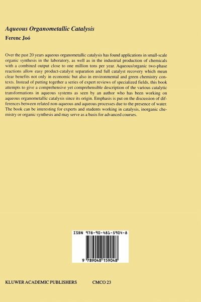 Over the past 20 years aqueous organometallic catalysis has found applications in small- scale organic synthesis in the laboratory, as well as in the industrial production of chemicals with a combined output close to one million tons per year. Aqueous/organic two-phase reactions allow easy product-catalyst separation and full catalyst recovery which mean clear benefits not only in economic but also in environmental and green chemistry contexts. Instead of putting together a series of expert reviews of specialized fields, this book attempts to give a comprehensive yet comprehensible description of the various catalytic transformations in aqueous systems as seen by an author who has been working on aqueous organometallic catalysis since its origin. Emphasis is put on the discussion of differences between related non-aqueous and aqueous processes due to the presence of water. The book will be of interest to experts and students working in catalysis, inorganic chemistryor organic synthesis, and may serve as a basis for advanced courses.