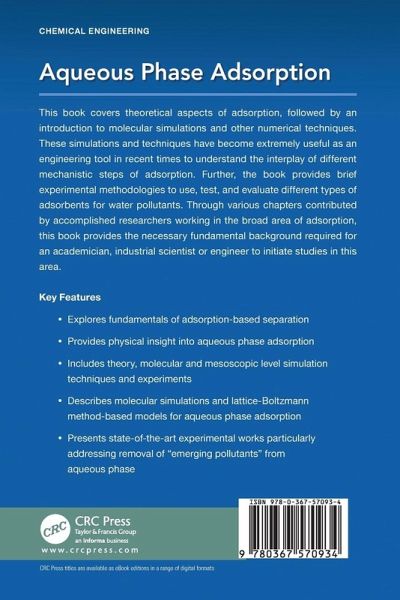 This book covers theoretical aspects of adsorption, followed by an introduction to molecular simulations and other numerical techniques that have become extremely useful as an engineering tool in recent times to understand the interplay of different mechanistic steps of adsorption. Further, the book provides brief experimental methodologies to use, test, and evaluate different types of adsorbents for water pollutants. Through different chapters contributed by accomplished researchers working in the broad area of adsorption, this book provides the necessary fundamental background required for an academician, industrial scientist or engineer to initiate studies in this area. Key Features Explores fundamentals of adsorption-based separation Provides physical insight into aqueous phase adsorption Includes theory, molecular and mesoscopic level simulation techniques and experiments Describes molecular simulations and lattice-Boltzmann method based models for aqueous phase adsorption Presents state-of-art experimental works particularly addressing removal of "emerging pollutants" from aqueous phase