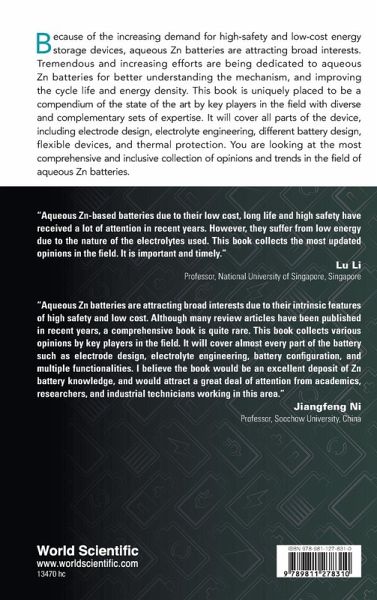 Because of the increasing demand for high-safety and low-cost energy storage devices, aqueous Zn batteries are attracting broad interests. Tremendous and increasing efforts are being dedicated to aqueous Zn batteries for better understanding the mechanism, and improving the cycle life and energy density. This book is uniquely placed to be a compendium of the state of the art by key players in the field with diverse and complementary sets of expertise. It will cover all parts of the device, including electrode design, electrolyte engineering, different battery design, flexible devices, and thermal protection. You are looking at the most comprehensive and inclusive collection of opinions and trends in the field of aqueous Zn batteries.