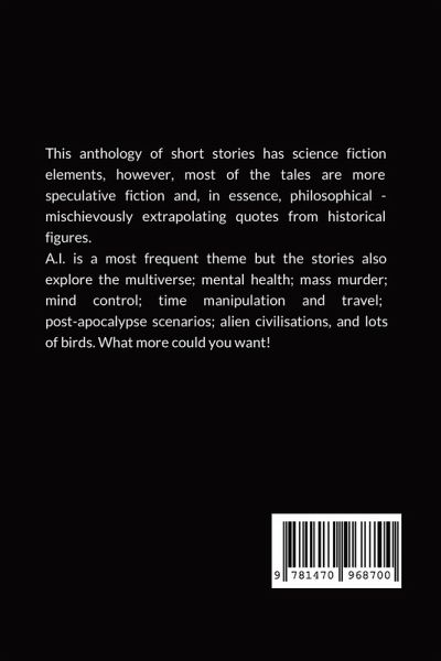 This anthology of short stories has science fiction elements, however, most of the tales are more speculative fiction and, in essence, philosophical - mischievously extrapolating quotes from historical figures. A.I. is a most frequent theme but the stories also explore the multiverse; mental health; mass murder; mind control; time manipulation and travel; post-apocalypse scenarios; alien civilisations, and lots of birds. What more could you want!