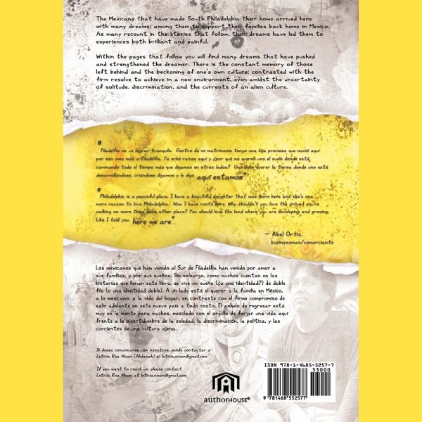The Mexicans that have made South Philadelphia their home arrived here with many dreams; among them to support their families back home in Mexico. As many recount in the stories that follow, their dreams have led them to experiences both brilliant and painful. Within the pages that follow you will find many dreams that have pushed and strengthened the dreamer. There is the constant memory of those left behind and the beckoning of one's own culture; contrasted with the firm resolve to achieve in a new environment, even amidst the uncertainty of solitude, discrimination, and the currents of an alien culture. "Filadelfia es un lograr tranquilo. Dentro de mi matrimonio tengo una hija preciosa que nació aquí por eso amo más a Filadelfia. Ya eché raíces aquí y ¿por qué no querer uno el suelo donde está caminando todo el tiempo más que digamos en otros lados? Uno debe querer la tierra donde uno está desarrollándose, criándose digamos y le digo aquí estamos". "Philadelphia is a peaceful place. I have a beautiful daughter that was born here and she's one more reason to love Philadelphia. Now I have roots here. Why shouldn't you love the ground you're walking on more than some other place? You should love the land where you are developing and growing. Like I told you, here we are". - Abel Ortiz, businessman/comerciante Los mexicanos que han venido al Sur de Filadelfia han venido por amor a sus familias, y por sus sueños. Sin embargo, como muchos cuentan en las historias que llenan este libro, se vive un sueño (¿o una identidad?) de doble filo (o una identidad doble). A un lado está el querer a la familia en México, a lo mexicano, a la vida del hogar, en contraste con el firme compromiso de salir adelante en este nuevo país a todo costo. El anhelo de regresar está muy en la mente para muchos, mezclado con el orgullo de forjar una vida aquí frente a la incertidumbre de la soledad, la discriminación, la política, y las corrientes de una cultura ajena. Si desea comunicarse con nosotros, puede contactar a Leticia Roa Nixon (Ahdanah) a: leticia.nixon@gmail.com If you want to reach us, please contact Leticia Roa Nixon at leticia.nixon@gmail.com