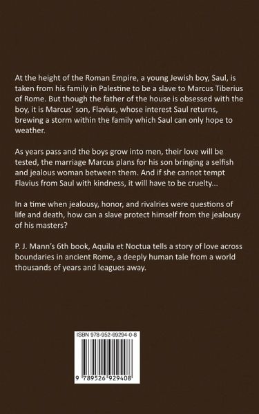 At the height of the Roman Empire, a young Jewish boy, Saul, is taken from his family in Palestine to be a slave to Marcus Tiberius of Rome. But though the father of the house is obsessed with the boy, it is Marcus' son, Flavius, whose interest Saul returns, brewing a storm within the family which Saul can only hope to weather. As years pass and the boys grow into men, their love will be tested, the marriage Marcus plans for his son bringing a selfish and jealous woman between them. And if she cannot tempt Flavius from Saul with kindness, it will have to be cruelty... In a time when jealousy, honor, and rivalries were questions of life and death, how can a slave protect himself from the jealousy of his masters? P. J. Mann's 6th book, Aquila et Noctua tells a story of love across boundaries in ancient Rome, a deeply human tale from a world thousands of years and leagues away.