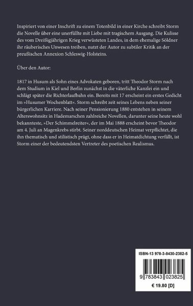 Inspiriert von einer Inschrift zu einem Totenbild in einer Kirche schreibt Storm die Novelle über eine unerfüllte mit Liebe mit tragischem Ausgang. Die Kulisse des vom Dreißigjährigen Krieg verwüsteten Landes, in dem ehemalige Söldner ihr räuberisches Unwesen treiben, nutzt der Autor zu subtiler Kritik an der preußischen Annexion Schleswig-Holsteins.