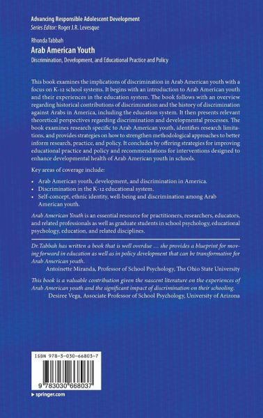 This book examines the implications of discrimination in Arab American youth with a focus on K-12 school systems. It begins with an introduction to Arab American youth and their experiences in the education system. The book follows with an overview regarding historical contributions of discrimination and the history of discrimination against Arabs in America, including the education system. It then presents relevant theoretical perspectives regarding discrimination and developmental processes. The book examines research specific to Arab American youth, identifies research limitations, and provides strategies on how to strengthen methodological approaches to better inform research, practice, and policy. It concludes by offering strategies for improving educational practice and policy and recommendations for interventions designed to enhance developmental health of Arab American youth in schools.