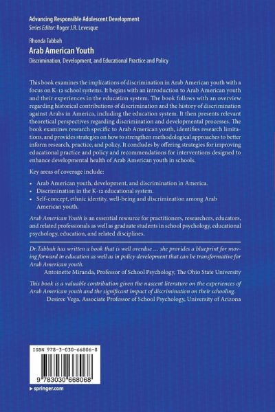 This book examines the implications of discrimination in Arab American youth with a focus on K-12 school systems. It begins with an introduction to Arab American youth and their experiences in the education system. The book follows with an overview regarding historical contributions of discrimination and the history of discrimination against Arabs in America, including the education system. It then presents relevant theoretical perspectives regarding discrimination and developmental processes. The book examines research specific to Arab American youth, identifies research limitations, and provides strategies on how to strengthen methodological approaches to better inform research, practice, and policy. It concludes by offering strategies for improving educational practice and policy and recommendations for interventions designed to enhance developmental health of Arab American youth in schools.