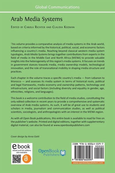 This volume provides a comparative analysis of media systems in the Arab world, based on criteria informed by the historical, political, social, and economic factors influencing a country's media. Reaching beyond classical western media system typologies, Arab Media Systems brings together contributions from experts in the field of media in the Middle East and North Africa (MENA) to provide valuable insights into the heterogeneity of this region's media systems. It focuses on trends in government stances towards media, media ownership models, technological innovation, and the role of transnational mobility in shaping media structure and practices. Each chapter in the volume traces a specific country's media - from Lebanon to Morocco - and assesses its media system in terms of historical roots, political and legal frameworks, media economy and ownership patterns, technology and infrastructure, and social factors (including diversity and equality in gender, age, ethnicities, religions, and languages). This book is a welcome contribution to the field of media studies, constituting the only edited collection in recent years to provide a comprehensive and systematic overview of Arab media systems. As such, it will be of great use to students and scholars in media, journalism and communication studies, as well as political scientists, sociologists, and anthropologists with an interest in the MENA region.