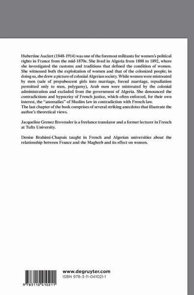 The book presents the first English edition of Hubertine Auclert's Arab Women in Algeria which offers a unique picture of Algerian society in late 19th century.