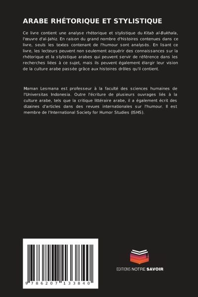 Ce livre contient une analyse rhétorique et stylistique du Kitab al-Bukhala, l'oeuvre d'al-Jahiz. En raison du grand nombre d'histoires contenues dans ce livre, seuls les textes contenant de l'humour sont analysés. En lisant ce livre, les lecteurs peuvent non seulement acquérir des connaissances sur la rhétorique et la stylistique arabes qui peuvent servir de référence dans les recherches liées à ce sujet, mais ils peuvent également élargir leur vision de la culture arabe passée grâce aux histoires drôles qu'il contient.