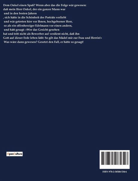 Dem Onkel einen Spaß? Wenn aber das die Folge wär gewesen: daß mein Herr Onkel, der ein ganzer Mann war und in den besten Jahren , sich hätte in die Schönheit des Porträts verliebt und wär getreten hier vor Ihnen, hochgeborner Herr, so als ein offenherziger Edelmann vor einen andern, und hätt gesagt: »Wer das Gesicht gesehen hat und tritt nicht als Bewerber auf verdient nicht, daß ihn Gott auf dieser Erde leben läßt: So gib das Mädel mir zur Frau und Herrin!« Was wäre dann gewesen? Gesetzt den Fall, er hätte so gesagt!