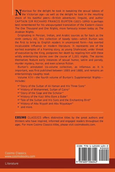 Notorious for the delight he took in tweaking the sexual taboos of the Victorian age-as well as the delight he took in the resulting shock of his bashful peers-British adventurer, linguist, and author CAPTAIN SIR RICHARD FRANCIS BURTON (1821-1890) is perhaps best remembered for his unexpurgated translation of the Eastern classic The One Thousand and One Nights, more famously known today as The Arabian Nights. Originating in Persian, Indian, and Arabic sources as far back as the ninth century AD, this collection of bawdy tales-which Burton was the first to bring to English readers in uncensored form-has exerted incalculable influence on modern literature. It represents one of the earliest examples of a framing story, as young Shahrazad, under threat of execution by the King, postpones her death by regaling him with these wildly entertaining stories over the course of 1,001 nights. The stories themselves feature early instances of sexual humor, satire and parody, murder mystery, horror, and even science fiction. Burton's annotated 16-volume collection, as infamous as it is important, was first published between 1885 and 1888, and remains an entertainingly naughty read. Volume XIV-the fourth volume of Burton's Supplemental Nights-includes: ¿ "Story of the Sultan of Al-Yaman and His Three Sons" ¿ "History of Mohammed, Sultan of Cairo" ¿ "Story of the Sage and the Scholar" ¿ "History of the Kazi Who Bare a Babe" ¿ "Tale of the Sultan and His Sons and the Enchanting Bird" ¿ "History of Abu Niyyah and Abu Niyyatayn" ¿ and more.