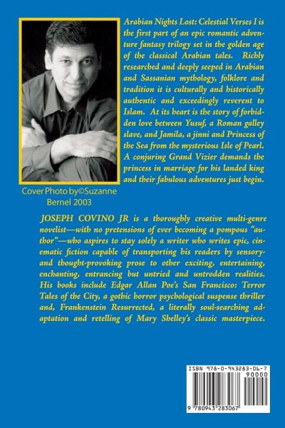 Arabian Nights Lost: Celestial Verses I is the first part of an epic romantic adventure fantasy trilogy set in the golden age of the classical Arabian tales. Richly researched and deeply seeped in Arabian and Sassanian mythology, folklore and tradition it is culturally and historically authentic and exceedingly reverent to Islam. At its heart is the story of forbidden love between Yusuf, a Roman galley slave, and Jamila, a Jinni and Princess of the Sea from the mysterious Isle of Pearl. A conjuring Grand Vizier demands the princess in marriage for his landed king and their fabulous adventures just begin.