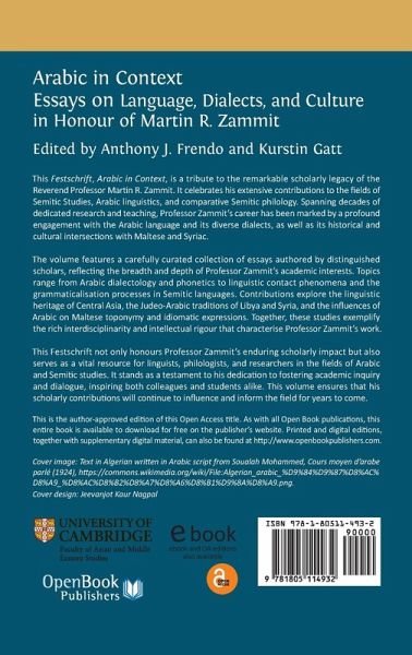 This Festschrift, Arabic in Context, is a tribute to the remarkable scholarly legacy of the Reverend Professor Martin R. Zammit. It celebrates his extensive contributions to the fields of Semitic Studies, Arabic linguistics, and comparative Semitic philology. Spanning decades of dedicated research and teaching, Professor Zammit's career has been marked by a profound engagement with the Arabic language and its diverse dialects, as well as its historical and cultural intersections with Maltese and Syriac. The volume features a carefully curated collection of essays authored by distinguished scholars, reflecting the breadth and depth of Professor Zammit's academic interests. Topics range from Arabic dialectology and phonetics to linguistic contact phenomena and the grammaticalisation processes in Semitic languages. Contributions explore the linguistic heritage of Central Asia, the Judeo-Arabic traditions of Libya and Syria, and the influences of Arabic on Maltese toponymy and idiomatic expressions. Together, these studies exemplify the rich interdisciplinarity and intellectual rigour that characterise Professor Zammit's work. This Festschrift not only honours Professor Zammit's enduring scholarly impact but also serves as a vital resource for linguists, philologists, and researchers in the fields of Arabic and Semitic studies. It stands as a testament to his dedication to fostering academic inquiry and dialogue, inspiring both colleagues and students alike. This volume ensures that his scholarly contributions will continue to influence and inform the field for years to come.