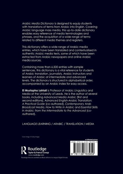 Arabic Media Dictionary is designed to equip students with translations of terms from Arabic into English. Covering Arabic language mass media, this up-to-date dictionary enables easy reference of media terminologies and phrases, and the acquisition of a wide range of terms related to different media themes and registers. This dictionary offers a wide range of Arabic media entries, which have been translated and contextualised in authentic Arabic media texts, some of which have been extracted from Arabic newspapers and online Arabic media sources. Containing more than 6500 entries with sample sentences, this dictionary is a vital reference for students of Arabic translation, journalists, Arabic instructors and learners of Arabic at intermediate and advanced levels. The dictionary is structured in alphabetical order, accompanied with an Arabic index for easy access.