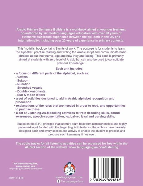 Arabic Primary Sentence Builders is a workbook aimed at younger learners, co-authored by six modern languages educators with over 90 years of extensive classroom experience between the six, both in the UK and internationally; including over 20 years of experience in primary contexts. This 'no-frills' book contains 9 units of work. The purpose is for students to learn the alphabet, practise reading and writing the Arabic script and communicate basic phrases about their name, age and how they are feeling. This book is primarily aimed at students with zero level of Arabic but can also be used to consolidate previous knowledge. Each unit includes: ¿ a focus on different parts of the alphabet, such as: - Vowels - Sukoon - Nunation - Stretched vowels - Double consonants - Sun & moon letters ¿ a set of activities designed to aid in Arabic alphabet recognition and production ¿ explanations of the rules that are needed in order to read, and opportunities to practise these ¿ a set of Listening-As-Modelling activities to train decoding skills, sound awareness, speech-segmentation, lexical-retrieval and parsing skills; Based on the E.P.I. principle that learners learn best from comprehensible and highly patterned input flooded with the target linguistic features, the authors have carefully designed each and every section and activity to enable the student to process and produce each item many times over. The audio tracks for all listening activities can be accessed for free within the AUDIO section of the website: www.language-gym.com/listening