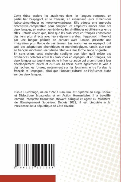 Cette thèse explore les arabismes dans les langues romanes, en particulier l'espagnol et le français, en examinant leurs dimensions lexico-sémantiques et morphosyntaxiques. Elle adopte une approche descriptive-comparative pour analyser les emprunts arabes dans ces deux langues, en mettant en évidence les similitudes et différences entre elles. L'étude révèle que, bien que les arabismes en français conservent des liens plus directs avec leurs étymons arabes, l'espagnol, influencé par une longue période de contact avec l'arabe, présente une intégration plus fluide de ces termes. Les arabismes en espagnol ont subi des adaptations phonétiques et morphologiques, tandis que ceux en français montrent une fidélité relative à leur forme arabe originale.En conclusion, cette recherche souligne que, bien qu'il existe des différences notables entre les arabismes en espagnol et en français, ces deux langues partagent une riche influence arabe qui a contribué à leur développement lexical et culturel. La thèse ouvre également la voie à des recherches futures, notamment sur les faux-amis entre l'arabe, le français et l'espagnol, ainsi que l'impact culturel de l'influence arabe sur ces deux langues.