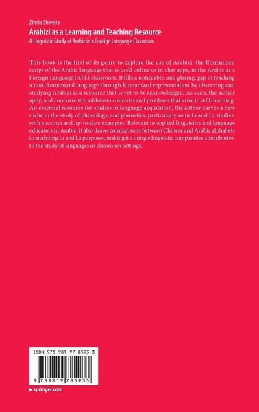 This book is the first of its genre to explore the use of Arabizi, the Romanized script of the Arabic language that is used online or in chat apps, in the Arabic as a Foreign Language (AFL) classroom. It fills a noticeable, and glaring, gap in teaching a non-Romanized language through Romanized representation by observing and studying Arabizi as a resource that is yet to be acknowledged. As such, the author aptly, and concurrently, addresses concerns and problems that arise in AFL learning. An essential resource for studies in language acquisition, the author carves a new niche in the study of phonology, and phonetics, particularly so in L1 and L2 studies, with succinct and up-to-date examples. Relevant to applied linguistics and language educators in Arabic, it also draws comparisons between Chinese and Arabic alphabets in analyzing L1 and L2 purposes, making it a unique linguistic comparative contribution to the study of languages in classroom settings.