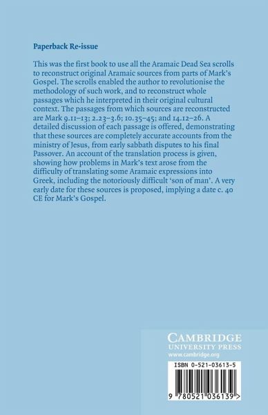 This 1999 book goes behind the Greek text of the Gospel of Mark and reconstructs some of its sources in the original Aramaic, the language which Jesus spoke. This work has been made possible by the publication of all the Aramaic Dead Sea Scrolls, which provide a basis of Jewish Aramaic for the right period.