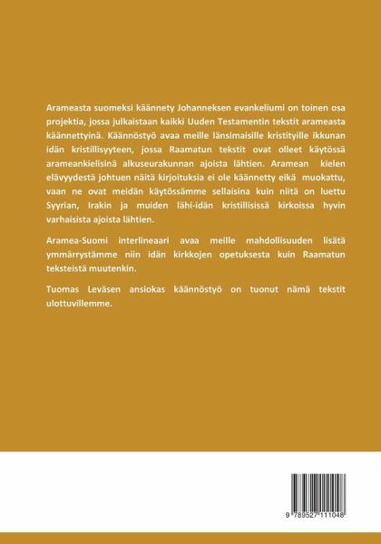 Aramea-Suomi, interlineaari, Johanneksen evankeliumi on toinen osa laajempaa projektia, jossa tuodaan Uuden Testamentin tekstit arameasta käännettynä suomalaisten Raamatun lukijoiden ja tutkijoiden ulottuville. Kirjan käännöstyöstä vastaa Tuomas Levänen Piikkiöstä