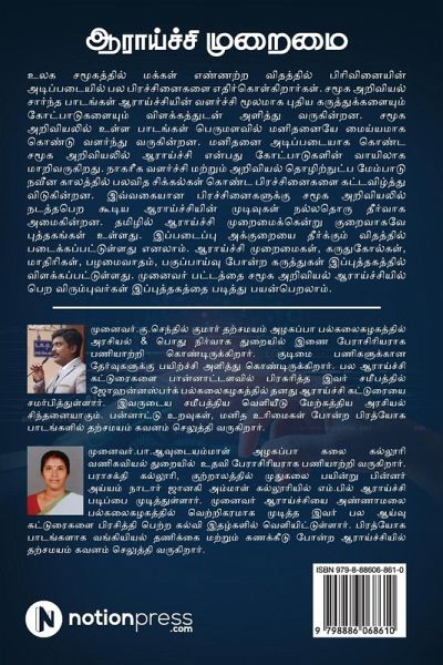 Research in social sciences is an inevitable and never-ending process that throws light on socio-political and economical issues. The human community of varied civilizations evolved and developed only because of research in social sciences that deals with men and minds. The inquisitiveness and critical inquiry had unleashed ample and astonishing inferences which unraveled hidden truths and realities. Be it the existence of god, casteism, communalism, rights violation, development issues, poverty, education, knowledge classification, social issues so on so forth., the research carried out in the aforementioned aspects had unearthed amazing remedies which helped the human community to cross the next part of the present civilization. This book on research methodology in Tamil is an additional contribution in the series of the introductory part which may be useful for doctoral candidates in social sciences.