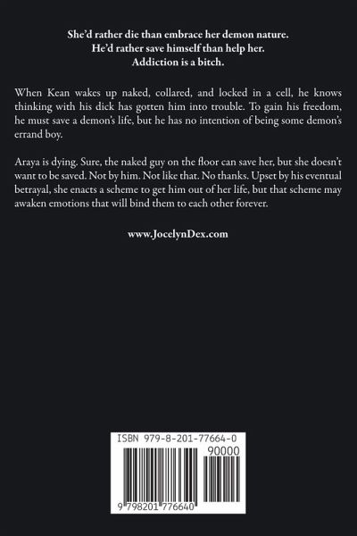 She'd rather die than embrace her demon nature. He'd rather save himself than help her. Addiction is a bitch. When Kean wakes up naked, collared, and locked in a cell, he knows thinking with his dick has gotten him into trouble. To gain his freedom, he must save a demon's life, but he has no intention of being some demon's errand boy. Araya is dying. Sure, the naked guy on the floor can save her, but she doesn't want to be saved. Not by him. Not like that. No thanks. Upset by his eventual betrayal, she enacts a scheme to get him out of her life, but that scheme may awaken emotions that will bind them to each other forever.