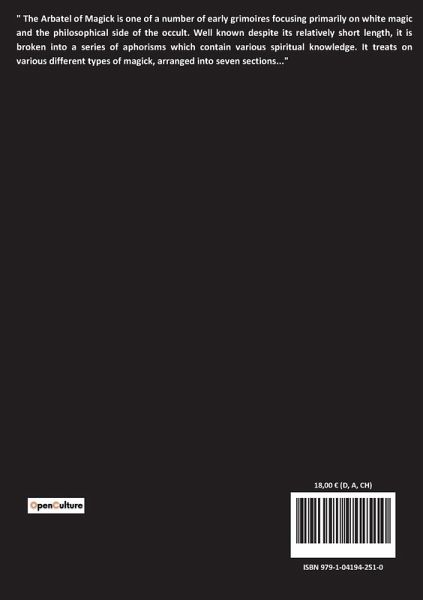" The Arbatel of Magick is one of a number of early grimoires focusing primarily on white magic and the philosophical side of the occult. Well known despite its relatively short length, it is broken into a series of aphorisms which contain various spiritual knowledge. It treats on various different types of magick, arranged into seven sections..."