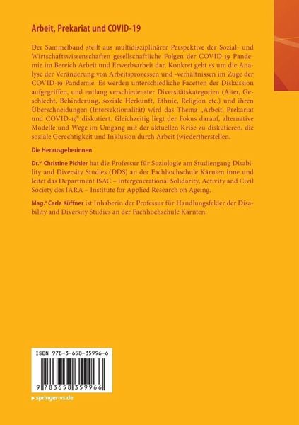 Arbeit, Prekariat und COVID-19.- Teil 1 Zur aktuellen Situation: Status quo zu Arbeit und Beschäftigung in Zeiten von COVID-19.- Alte und neue Formen des Prekariats - Umbrüche der Arbeitswelt in der COVID-19-Pandemie.- Folgen von Arbeitslosigkeit für erwerbsfähige Personen der Generation 50+ und besondere Herausforderungen während der COVID-19-Pandemie.- Strukturell belastende Faktoren für Frauen in der Corona-Pandemie.- Teil 2 Herausforderungen und Lösungen für spezifische Personengruppen.- Arbeitsmarktbedingte Herausforderungen und Potentiale der COVID-19-Pandemie für Migrant*innen in Österreich.- Verteiltes Arbeiten während der COVID-19-Pandemie: Bestandsaufnahme, Diskriminierungspotenziale, Handlungsempfehlungen.- Teil 3 Wege zur (Wieder-)Herstellung von sozialer Gerechtigkeit und Inklusion am Arbeitsmarkt.- Gesellschaftliche Veränderungen durch COVID-19 - Chancen und Risiken für soziale Gerechtigkeit und Inklusion am Arbeitsmarkt.