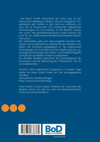 Mit dieser Schrift promovierte der Autor 1974 an der Universität Heidelberg in Medizin. Die jezt vorliegende Erstpublikation gibt Einblick in jene Jahre des Umbruchs um1970, die in Wissenschaft und Gesellschaft tiefgreifende Veränderungen mit sich brachten. In der Medizin wurden nun sozial- und gesundheitspolitische Fragen relevant, die auch für die aufkommende Rehabilitationsmedizin bedeutsam waren.Die Doktorarbeit geht vom Spannungsfeld zwischen Individuum und Gesellschaft aus, welches für das Verhältnis von Arbeit und Krankheit grundlegend ist. Die medizinische Anthropologie mit ihrem Blick auf das Subjekt regt dazu an, ideologische Fixierungen des Arbeits- und Krankheitsbegriffs auch jenseits der Medizin kritisch zu analysieren.Ein aktueller Rückblick beleuchtet die Entstehungszeit der Dissertation und die Bedeutung des "Doktorvaters" für ihr Zustandekommen.