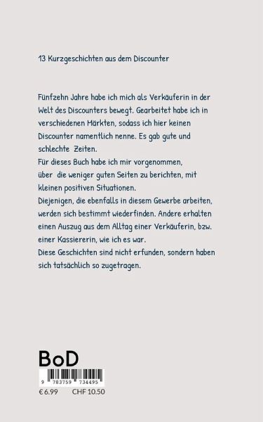 13 Kurzgeschichten aus dem DiscounterFünfzehn Jahre habe ich mich als Verkäuferin in der Welt des Discounters bewegt. Gearbeitet habe ich in verschiedenen Märkten, sodass ich hier keinen Discounter namentlich nenne. Es gab gute und schlechte Zeiten. Für dieses Buch habe ich mir vorgenommen, über die weniger guten Seiten zu berichten, mit kleinen positiven Situationen.Diejenigen, die ebenfalls in diesem Gewerbe arbeiten, werden sich bestimmt wiederfinden. Andere erhalten einen Auszug aus dem Alltag einer Verkäuferin, bzw. einer Kassiererin, wie ich es war. Diese Geschichten sind nicht erfunden, sondern haben sich tatsächlich so zugetragen.