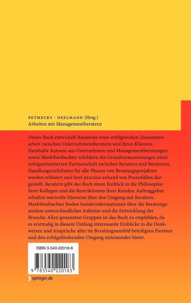 Dieses Buch entwickelt Bausteine einer erfolgreichen Zusammenarbeit zwischen Unternehmensberatern und ihren Klienten. Namhafte Autoren aus Unternehmen und Managementberatungen sowie Marktbeobachter schildern die Grundvoraussetzungen einer erfolgsorientierten Partnerschaft zwischen Beratern und Beratenen. Handlungsrichtlinien für alle Phasen von Beratungsprojekten werden erläutert und best-practice anhand von Praxisfällen dargestellt. Beratern gibt das Buch einen Einblick in die Philosophie ihrer Kollegen und die Restriktionen ihrer Kunden. Auftraggeber erhalten wertvolle Hinweise über den Umgang mit Beratern. Marktbeobachter finden Insiderinformationen über die Beratungsansätze unterschiedlicher Anbieter und die Entwicklung der Branche. Allen genannten Gruppen ist das Buch zu empfehlen, da es erstmalig in diesem Umfang interessante Einblicke in die Denkweisen und Ansprüche aller im Beratungsumfeld beteiligten Parteien und den erfolgsfördernden Umgang miteinander bietet.