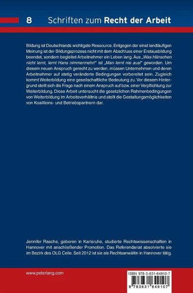 Bildung ist Deutschlands wichtigste Ressource. Entgegen der einst landläufigen Meinung ist der Bildungsprozess nicht mit dem Abschluss einer Erstausbildung beendet, sondern begleitet Arbeitnehmer ein Leben lang. Aus «Was Hänschen nicht lernt, lernt Hans nimmermehr!» ist «Man lernt nie aus!» geworden. Um diesem neuen Anspruch gerecht zu werden, müssen Unternehmen und deren Arbeitnehmer auf stetig veränderte Bedingungen vorbereitet sein. Zugleich kommt Weiterbildung eine gesellschaftliche Bedeutung zu. Vor diesem Hintergrund stellt sich die Frage nach einem Anspruch auf bzw. einer Verpflichtung zur Weiterbildung. Diese Arbeit untersucht die gesetzlichen Rahmenbedingungen von Weiterbildung im Arbeitsverhältnis und stellt die Gestaltungsmöglichkeiten von Koalitions- und Betriebspartnern dar.