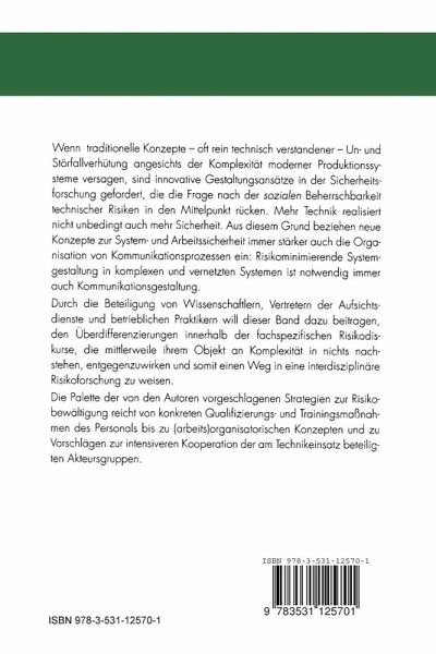 Wenn traditionelle Konzepte - oft rein technisch verstandener - Un- und Störfallverhütung angesichts der Komplexität moderner Produktionssysteme versagen, sind innovative Gestaltungsansätze in der Sicherheitsforschung gefordert, die die Frage nach der sozialen Beherrschbarkeit technischer Risiken in den Mittelpunkt rücken. Mehr Technik realisiert nicht unbedingt auch mehr Sicherheit. Aus diesem Grund beziehen neue Konzepte zur System- und Arbeitssicherheit immer stärker auch die Organisation von Kommunikationsprozessen ein: Risikominimierende Systemgestaltung in komplexen und vernetzten Systemen ist notwendig immer auch Kommunikationsgestaltung.Durch die Beteiligung von Wissenschaftlern, Vertretern der Aufsichtsdienste und betrieblichen Praktikern will dieser Band dazu beitragen, den Überdifferenzierungen innerhalb der fachspezifischen Risikodiskurse, die mittlerweile ihrem Objekt an Komplexität in nichts nachstehen, entgegenzuwirken und somit einen Weg in eine interdisziplinäre Risikoforschung zu weisen.Die Palette der von den Autoren vorgeschlagenen Strategien zur Risikobewältigung reicht von konkreten Qualifizierungs- und Trainingsmaßnahmen des Personals über (arbeits)organisatorische Konzepte bis zu Vorschlägen für eine intensivere Kooperation der am Technikeinsatz beteiligten Akteursgruppen.