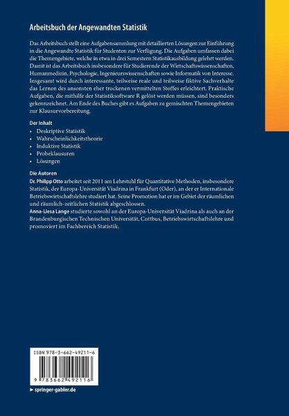 Das Arbeitsbuch stellt eine Aufgabensammlung mit detaillierten Lösungen zur Einführung in die Angewandte Statistik für Studenten zur Verfügung. Die Aufgaben umfassen dabei die Themengebiete, welche in etwa in drei Semestern Statistikausbildung gelehrt werden. Damit ist das Arbeitsbuch insbesondere für Studierende der Wirtschaftswissenschaften, Humanmedizin, Psychologie, Ingenieurswissenschaften sowie Informatik von Interesse. Insgesamt wird durch interessante, teilweise reale und teilweise fiktive Sachverhalte das Lernen des ansonsten eher trockenen vermittelten Stoffes erleichtert. Praktische Aufgaben, die mithilfe der Statistiksoftware R gelöst werden müssen, sind besonders gekennzeichnet. Am Ende des Buches gibt es Aufgaben zu gemischten Themengebieten zur Klausurvorbereitung.