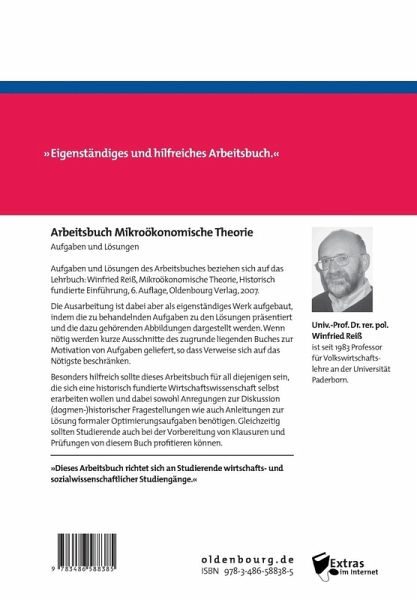 Dieses Arbeitsbuch richtet sich an Studierende wirtschafts- und sozialwissenschaftlicher Studiengänge. Aufgaben und Lösungen des Arbeitsbuches beziehen sich auf das Lehrbuch Winfried Reiß, Mikroökonomische Theorie, Historisch fundierte Einführung, 6. Auflage, Oldenbourg Verlag, 2007. Die Ausarbeitung ist dabei aber als eigenständiges Werk aufgebaut, indem die zu behandelnden Aufgaben zu den Lösungen präsentiert und die dazu gehörenden Abbildungen dargestellt werden. Wenn nötig werden kurze Ausschnitte des zugrunde liegenden Buches zur Motivation von Aufgaben geliefert, so dass Verweise sich auf das Nötigste beschränken. Besonders hilfreich sollte dieses Arbeitsbuch für all diejenigen sein, die sich eine historisch fundierte Wirtschaftswissenschaft selbst erarbeiten wollen und dabei sowohl Anregungen zur Diskussion (dogmen-)historischer Fragestellungen wie auch Anleitungen zur Lösung formaler Optimierungsaufgaben benötigen. Gleichzeitig sollten Studierende auch bei der Vorbereitung von Klausuren und Prüfungen von diesem Buch profitieren können.