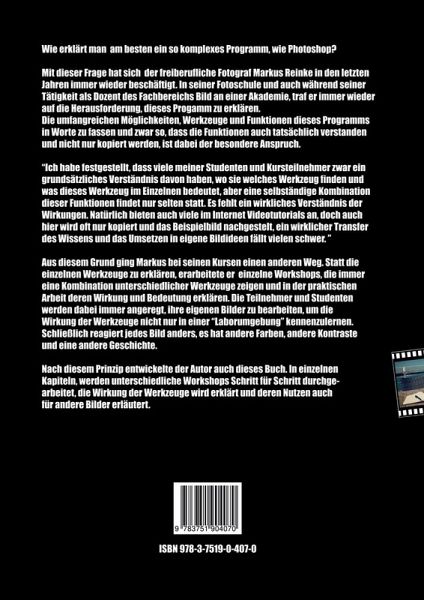 Wie erklärt man am besten ein so komplexes Programm, wie Photoshop?Mit dieser Frage hat sich der freiberufliche Fotograf Markus Reinke in den letzten Jahren immer wieder beschäftigt. In seiner Fotoschule und auch während seiner Tätigkeit als Dozent des Fachbereichs Bild an einer Akademie, traf er immer wieder auf die Herausforderung, dieses Progamm zu erklären. Die umfangreichen Möglichkeiten, Werkzeuge und Funktionen dieses Programms in Worte zu fassen und zwar so, dass die Funktionen auch tatsächlich verstanden und nicht nur kopiert werden, ist dabei der besondere Anspruch. "Ich habe festgestellt, dass viele meiner Studenten und Kursteilnehmer zwar ein grundsätzliches Verständnis davon haben, wo sie welches Werkzeug finden und was dieses Werkzeug im Einzelnen bedeutet, aber eine selbständige Kombination dieser Funktionen findet nur selten statt. Es fehlt ein wirkliches Verständnis der Wirkungen. Natürlich bieten auch viele im Internet Videotutorials an, doch auch hier wird oft nur kopiert und das Beispielbild nachgestelt, ein wirklicher Transfer des Wissens und das Umsetzen in eigene Bildideen fällt vielen schwer."Aus diesem Grund ging Markus bei seinen Kursen einen anderen Weg. Statt die einzelnen Werkzeuge zu erklären, erarbeitete er einzelne Workshops, die immer eine Kombination unterschiedlicher Werkzeuge zeigen und in der praktischen Arbeit deren Wirkung und Bedeutung erklären. Die Teilnehmer und Studenten werden dabei immer angeregt, ihre eigenen Bilder zu bearbeiten, um die Wirkung der Werkzeuge nicht nur in einer Laborumgebung kennenzulernen.Schließlich reagiert jedes Bild anders, es hat andere Farben, andere Kontraste und eine andere Geschichte.Nach diesem Prinzip entwickelte der Autor auch dieses Buch. In einzelnen Kapiteln, werden unterschiedliche Workshops Schritt für Schritt durchgearbeitet, die Wirkung der Werkzeuge wird erklärt und deren Nutzen auch für andere Bilder erläutert.